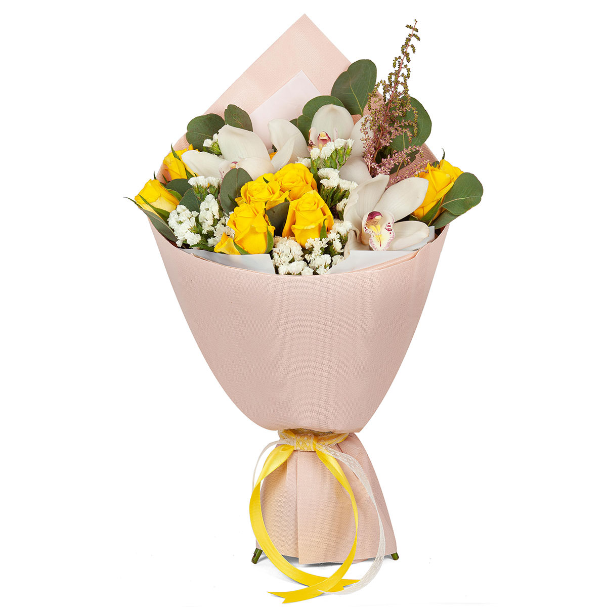 Орхидея белая, роза кустовая желтая, статица белая, эвкалипт. Упаковка (лента, пленка, крафт, сетка, пленка матовая)