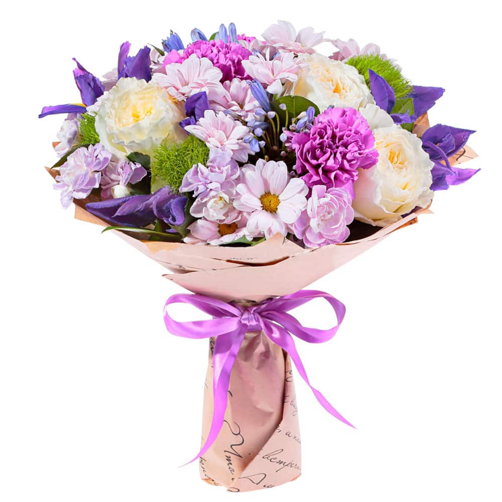 Роза пионовидная кремовая, гвоздика сиреневая, хризантема кустовая розовая, ирис, зелень. Упаковка (лента, пленка, крафт, сетка, пленка матовая)