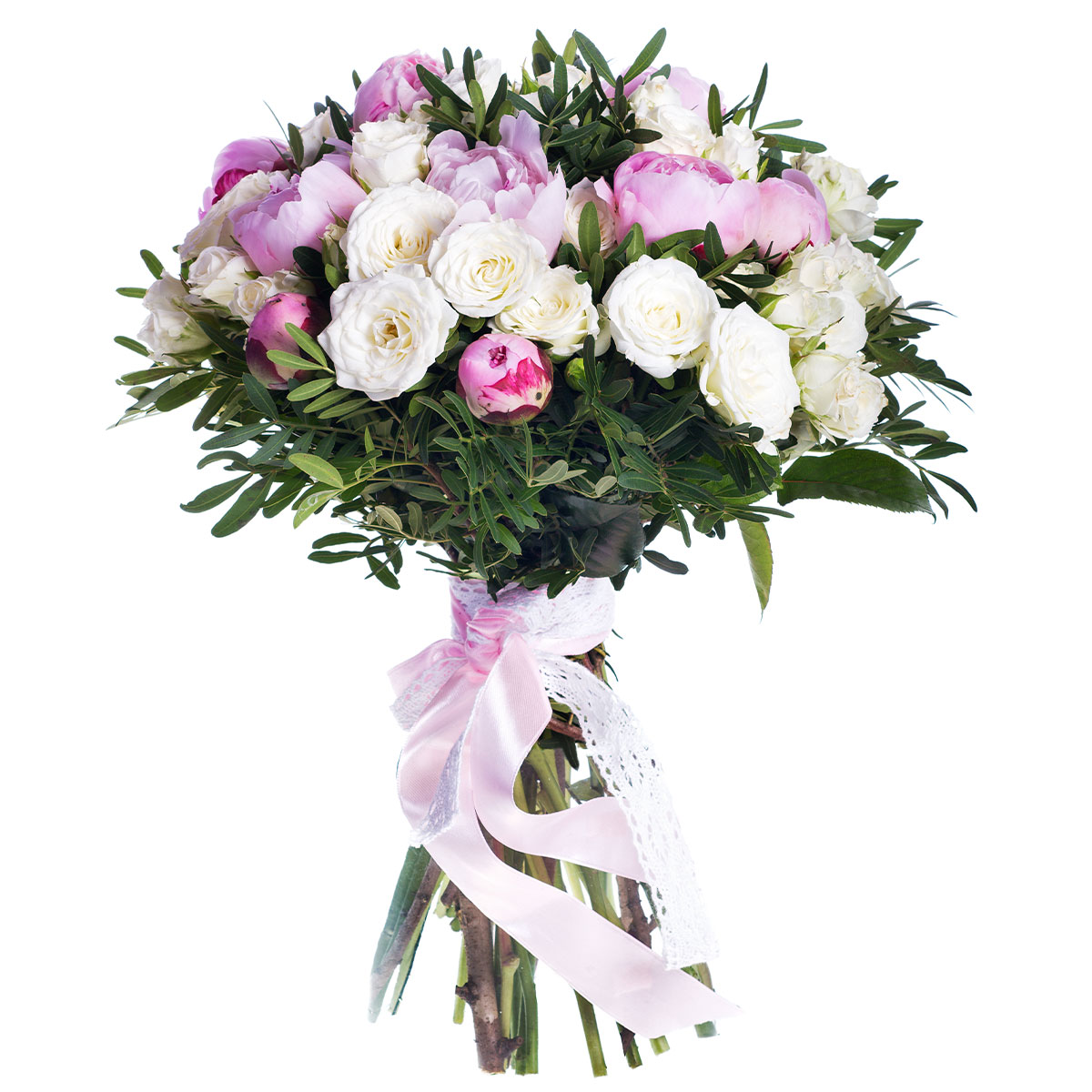 Пион розовый, роза кустовая белая, фисташка, зелень. Упаковка (лента, пленка, крафт, сетка, пленка матовая)