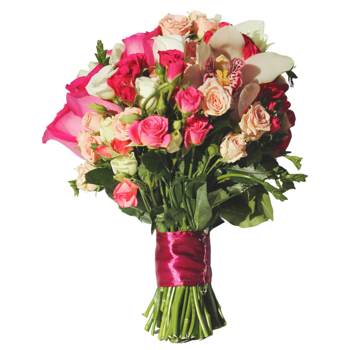 Орхидея белая, роза одноголовая розовая, роза кустовая розовая и белая. Упаковка (лента, пленка, крафт, сетка, пленка матовая)