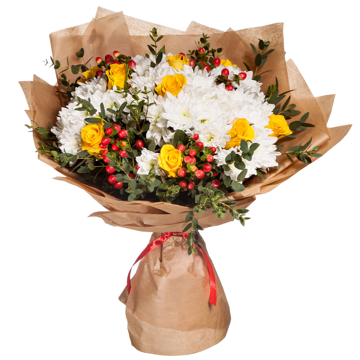 Хризантема кустовая белая, роза кустовая желтая, гиперикум, зелень. Упаковка (лента, пленка, крафт, сетка, пленка матовая)