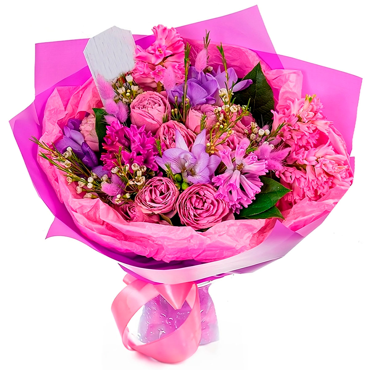 Роза пионовидная розовая, альстромерия розовая, фрезия сиреневая, гиацинт розовый, статица, ирис, ваксфлауэр, лагурус. Упаковка (лента, пленка, крафт, сетка, пленка матовая)