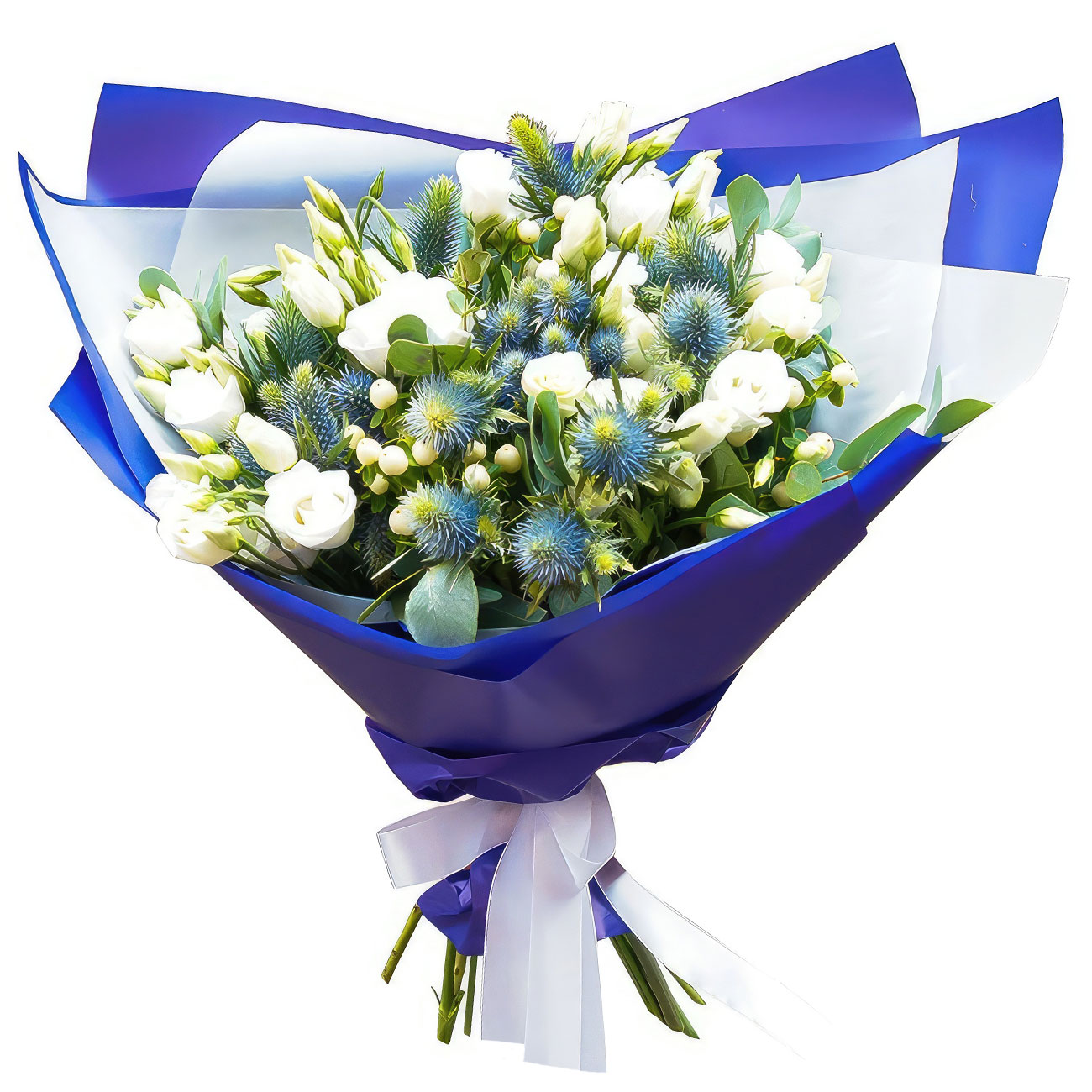 Эрингиум, эустома (лизиантус) белая, гиперикум. Упаковка (лента, пленка, крафт, сетка, пленка матовая)