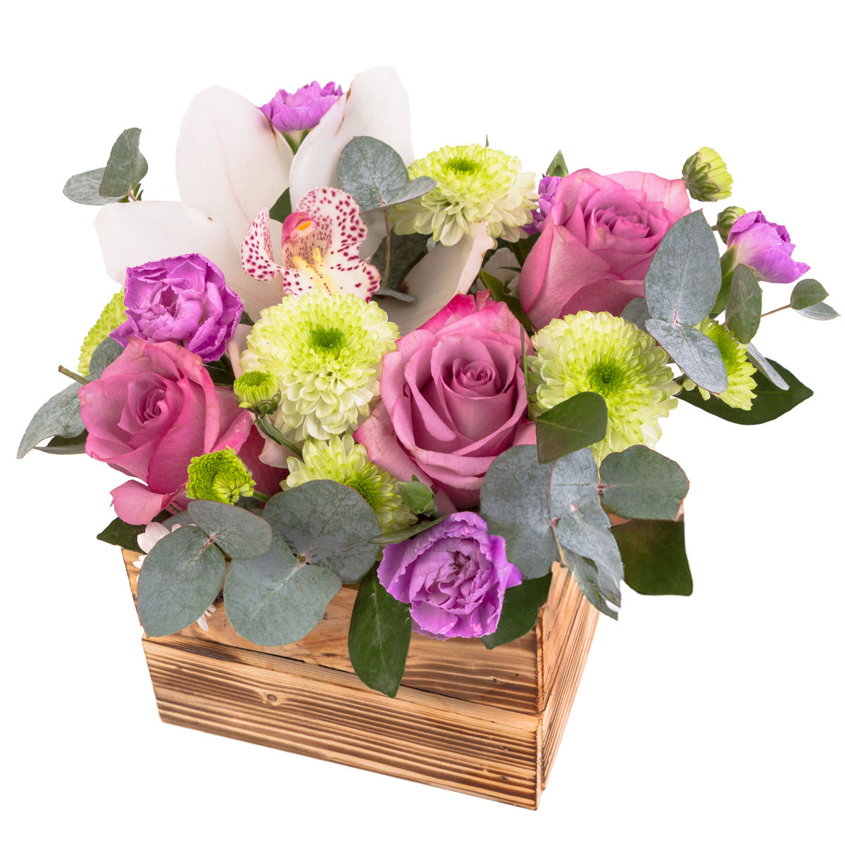 Орхидея белая, роза одноголовая розовая, хризантема кустовая зеленая, гвоздика сиреневая, эвкалипт. Упаковка (Корзина, оазис, ящик).