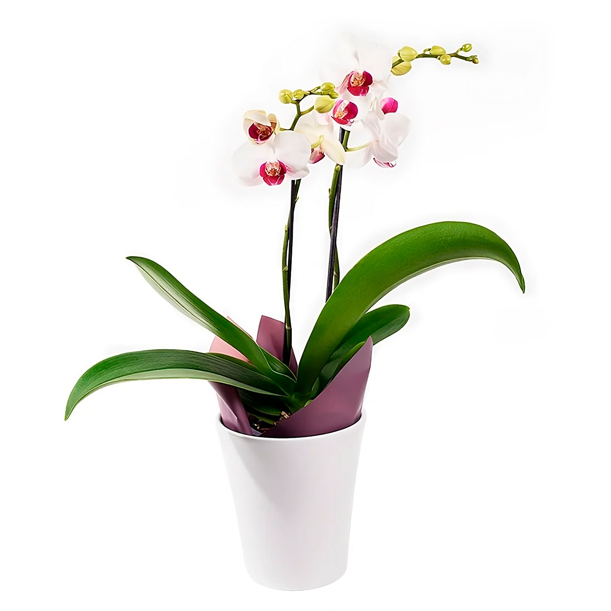 Завораживающая двухстебельная орхидея в горшке – это лучший подарок, который будет украшать интерьер и радовать взор своим великолепием. Этот цветок удивит своими пышными цветами, сложными орнаментами и богатым ароматом. Идеально подойдет для декора рабочего места или гостиной и будет радовать своим цветением до трех месяцев. Сделайте подарок себе или своим близким, который напомнит о вас на протяжении долгого времени.