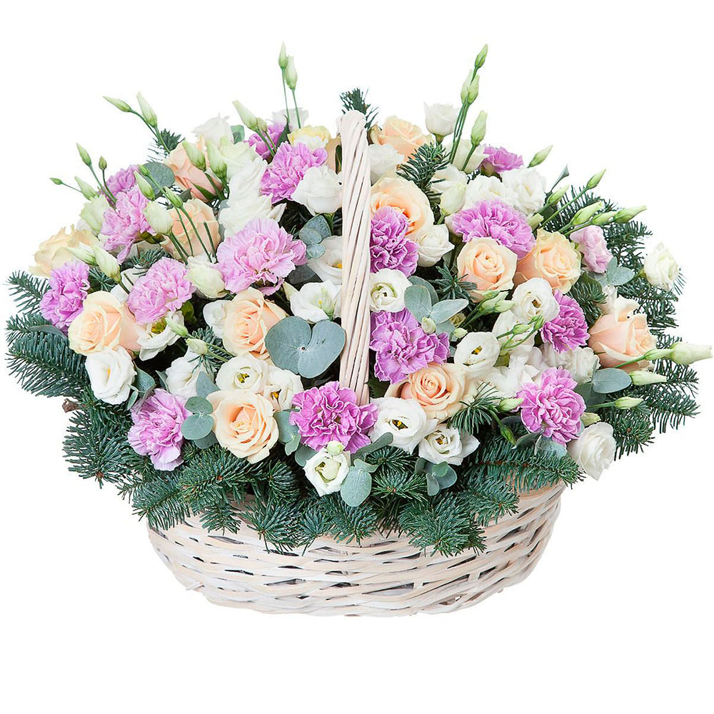 Эустома белая, гвоздика сиреневая, роза кустовая кремовая, нобилис. Упаковка (Корзина, оазис).